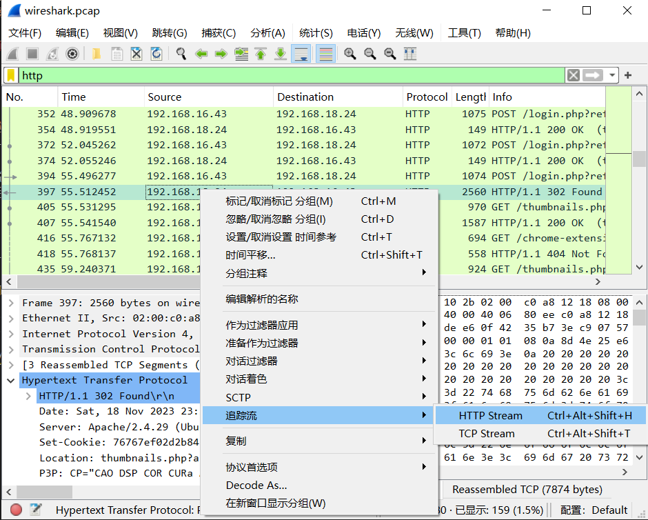 wireshark 打开,先过滤 http 请求,然后追踪 http 流,通过关键字 &password 搜索,找到返回为 302 跳转的请求。