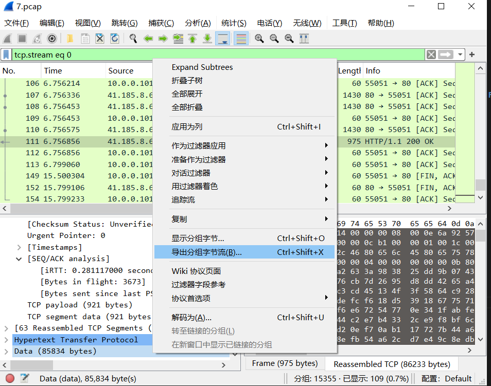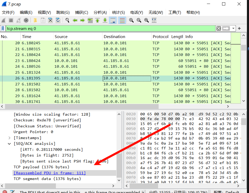 随便点一个传输的流量中,再点击 Reassembled PDU 找到最终的组合包